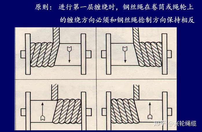 鋼絲繩在卷筒上纏繞方向,必須是使鋼絲繩緊捻而不是松捻的方向纏繞。右旋繩槽的卷筒推薦使用左捻鋼絲繩,反之,左旋繩槽的卷筒應(yīng)使用右捻鋼絲繩。
