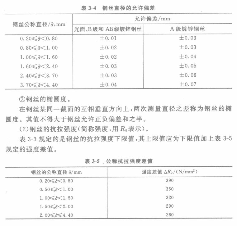 用精度為0.01mm的千分尺,在鋼絲的同一截面內(nèi)互相垂直的方向上兩次測量所得直徑的算術(shù)平均值,即為鋼絲的實際直徑。其允許偏差應符合表3-4的規(guī)定。