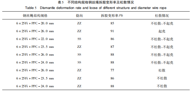 通過(guò)長(zhǎng)期的生產(chǎn)驗(yàn)證,6×25Fi+PPC結(jié)構(gòu)不同直徑同向捻鋼絲繩不松散、不起殼狀態(tài)下的拆股變形率控制在85%~88%較好,不同結(jié)構(gòu)規(guī)格鋼絲繩拆股變形率及松散情況見表5。