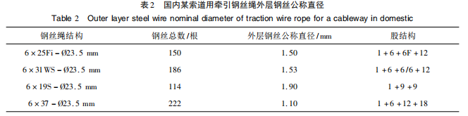 d=D/(n+3.5)=1.51mm,這與實(shí)際數(shù)據(jù)1.50mm相差不大。在相同繩徑下鋼絲數(shù)多的鋼絲繩其外層鋼絲直徑較細(xì),鋼絲之間的相對(duì)滑動(dòng)較容易,鋼絲繩越柔軟,耐彎曲疲勞性能越好旦。載人索道對(duì)鋼絲繩安全系數(shù)要求很高,因此,鋼絲繩結(jié)構(gòu)選擇尤為重要,而鋼絲繩股的外層鋼絲直徑對(duì)鋼絲繩的使用效果影響較大。國(guó)內(nèi)某索道用牽引鋼絲繩外層鋼絲公稱直徑見表2。
