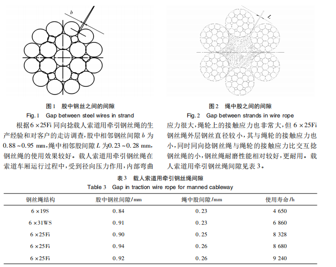國(guó)內(nèi)外實(shí)踐證明,載人索道用牽引鋼絲繩的外層鋼絲直徑最佳范圍在1.0~3.0mm,鋼絲直徑過(guò)小易磨損造成疲勞斷裂,鋼絲直徑過(guò)大會(huì)使鋼絲繩柔軟性變差,不宜編織。
