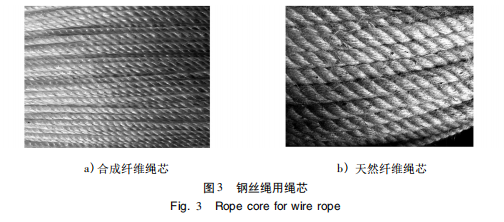 根據(jù)索道的使用環(huán)境,繩芯一般選用合成纖維繩芯(PPC),合成纖維繩芯具有耐腐蝕性、耐擠壓性強(qiáng),鋼絲繩柔軟性較好。在索道往復(fù)運(yùn)行過(guò)程中鋼絲繩不斷受到?jīng)_擊載荷及橫向擠壓作用力時(shí),纖維繩芯能夠起支撐鋼絲繩結(jié)構(gòu)的作用,減小各股間的相對(duì)滑動(dòng)。如果沒有鋼絲繩芯支撐和潤(rùn)滑鋼絲繩各股,鋼絲繩各股就會(huì)相互擠壓,導(dǎo)致鋼絲繩結(jié)構(gòu)破壞和鋼絲繩各股間磨損增大。在索道緊急啟動(dòng)和停止時(shí)會(huì)對(duì)鋼絲繩產(chǎn)生慣性動(dòng)載荷,纖維繩芯能減小動(dòng)載荷對(duì)鋼絲繩的損傷四。合成纖維繩芯直徑波動(dòng)范圍較小,繩芯的捻距和直徑直接影響鋼絲繩的使用效果。鋼絲繩用繩芯如圖3所示。根據(jù)鋼絲繩公稱直徑計(jì)算繩芯直徑如下,m=D/d