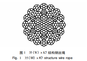 隨著國家“一帶一路”政策深入推進(jìn),配套工程機(jī)械用鋼絲繩迎來新的機(jī)遇和挑戰(zhàn),特別是隨著進(jìn)口工程機(jī)械以及國內(nèi)起重機(jī)械大型化的發(fā)展,要求鋼絲繩應(yīng)具有高破斷拉力,促進(jìn)了高強(qiáng)度、高破斷、高耐磨、抗旋轉(zhuǎn)多層壓實股鋼絲繩需求持續(xù)增加。本公司多次接到國內(nèi)大型起重機(jī)械主機(jī)單位批量鋼絲繩訂單,要求鋼絲繩直徑35.5mm,最小破斷拉力1050kN,微旋轉(zhuǎn)、耐磨性好。查閱標(biāo)準(zhǔn)GB/T 20118、GB8918,相同直徑范圍產(chǎn)品均無法滿足客戶最小破斷拉力要求0-1,對比YB/T5359一2010標(biāo)準(zhǔn)力學(xué)性能表發(fā)現(xiàn)相同結(jié)構(gòu)面接觸產(chǎn)品較普通結(jié)構(gòu)整繩破斷拉力高12%0,符合客戶高破斷拉力要求,而35(W)×7是典型的抗旋轉(zhuǎn)結(jié)構(gòu)鋼絲繩,基于以上分析最終選定面接觸35(W)xK7結(jié)構(gòu)鋼絲繩,公稱抗拉強(qiáng)度1960MPa,35(W)×K7結(jié)構(gòu)鋼絲繩如圖1所示。