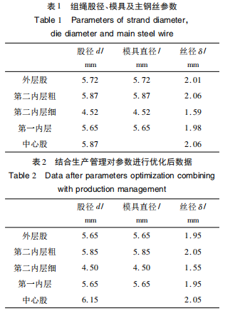 經(jīng)過設(shè)計計算,組繩股徑、模具及主鋼絲直徑見表1,對參數(shù)進(jìn)行優(yōu)化后的數(shù)據(jù)見表2。