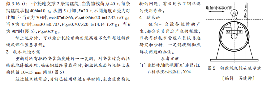 鋼絲繩托輪作用是鋼絲繩在自身重力作用下發(fā)生下垂時支撐住鋼絲繩來回運動,確保不與臂架結構件表面直接產(chǎn)生剛性摩擦。如果鋼絲繩托輪安裝出問題,輕則門機無法正常使用,重則會造成鋼絲繩加劇磨損,最終導致鋼絲繩發(fā)生斷裂,引發(fā)生產(chǎn)安全事故。海南八所港務有限責任公司于2008年購置2臺MQ2533門座式起重機,在使用過程中發(fā)現(xiàn)起升鋼絲繩托輪經(jīng)常損壞,主要表現(xiàn)在托輪被磨穿斷裂,維修更換頻率比較高,鋼絲繩使用壽命也比其他門機要短的多。針對這一問題,組織相關技術人員進行深入研究和分析,發(fā)現(xiàn)托輪磨穿及鋼絲繩使用壽命短的主要原因是維修人員在安裝托輪時安裝過高,造成鋼絲繩來回運動時托輪受到鋼絲繩頻繁摩擦和擠壓,加速托輪磨損而發(fā)生斷裂,同時也加劇鋼絲繩的磨損,通過技術改造后,托輪磨穿問題得到徹底解決,連續(xù)使用6年時間,未再發(fā)生托輪被磨穿斷裂問題,同時延長鋼絲繩使用壽命。