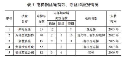 在電梯的年度定期檢驗(yàn)過(guò)程中,經(jīng)常會(huì)發(fā)現(xiàn)電梯鋼絲繩存在失效的情況,可視的失效模式有:銹蝕、斷絲和磨損三種。鋼絲繩銹蝕的情況在觀光電梯和貨梯出現(xiàn)的比較多,從機(jī)房到井道到處都是紅褐色的鋼絲繩銹斑;鋼絲繩斷絲的情況是任何一種電梯都有存在的;鋼絲繩磨損的情況是伴隨著銹蝕,只要有銹蝕的鋼絲繩也就伴隨著磨損,鋼絲繩磨損在電梯機(jī)房就可以清楚看得到,鋼絲繩磨損時(shí)間久了就會(huì)再引起電梯曳引輪的磨損。通過(guò)收集過(guò)往的電梯檢驗(yàn)情況(見(jiàn)表1),可以看出鋼絲繩失效情況的嚴(yán)重性。電梯鋼絲繩銹蝕、斷絲和磨損失效將直接導(dǎo)致電梯安全事故,為了盡可能避免人身事故的發(fā)生,應(yīng)該引起用戶、維保及檢驗(yàn)相關(guān)部門的高度重視,促進(jìn)電梯的安全使用。