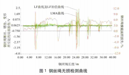 檢測(cè)結(jié)果:1)檢測(cè)鋼絲繩長(zhǎng)度:38.76m。2)鋼絲繩金屬斷面積減少最大差值:15.30%,位置;7.28m。