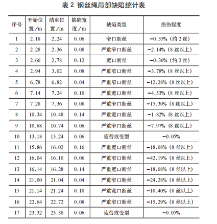 如對(duì)??顾帢I(yè)的一臺(tái)貨梯鋼絲繩利用EMT-C智能鋼絲繩探傷儀進(jìn)行無(wú)損檢測(cè)的結(jié)果(見(jiàn)圖1和表2)。