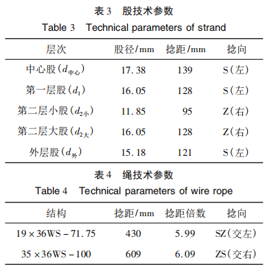 上述各層股徑均為計(jì)算值,根據(jù)生產(chǎn)經(jīng)驗(yàn)及股在繩中的合理排列,股的捻距倍數(shù)均取8倍,各股直徑、捻距調(diào)整后參數(shù)見表3,內(nèi)、外層繩技術(shù)參數(shù)見表4。