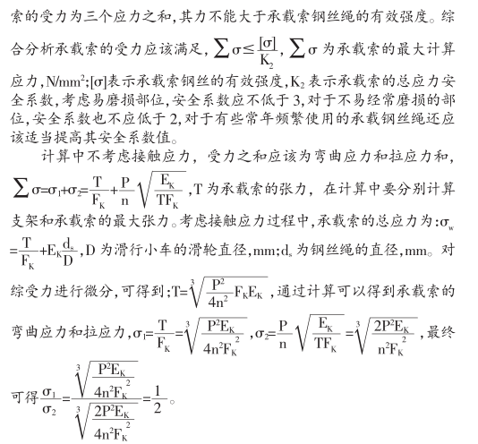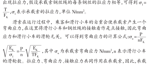 滑索在運行中,鋼絲絕受力不同,承載索受到3個作用力,其分別為接觸應(yīng)力、彎曲應(yīng)力、拉應(yīng)力。3個作用力中,彎曲應(yīng)力對承載索的磨損影響十分大,但對承載索的強度影響極小,國此,在進行滑索的承花索的選行計算分祈時,是把拉應(yīng)力作為強度條件,把彎曲應(yīng)力作為承截索耐房強度的驗算分析條件。彎由應(yīng)力對于承載索也是十分重要,但是其計算十分困難,目前基本是結(jié)果理論知識進行救斷的,在實際中,一般都是用實際經(jīng)驗和理論知識站合分析的,由于張力作用,承載索上會