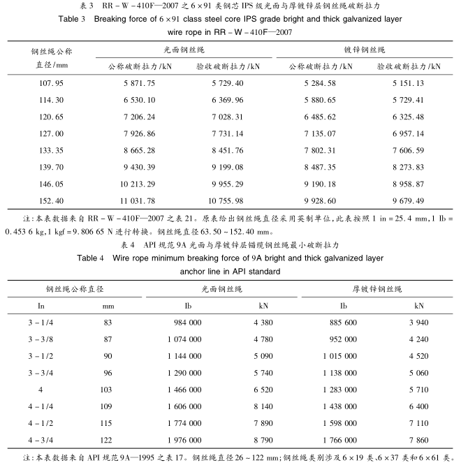 RR-W-410D-88]、RR-W-410E一2002]、RR-W-410F-2007給出相同結(jié)構(gòu)類別、級別、公稱直徑的厚鍍鋅鋼絲繩,其公稱破斷拉力(注:即最小破斷拉力)與光面鋼絲繩和薄鍍鋅層鋼絲繩不同,前者相對后二者有明顯的降低。部分?jǐn)?shù)據(jù)見表1、表2、表3(注:對比不同時(shí)期標(biāo)準(zhǔn),相關(guān)參數(shù)繼續(xù)保持該規(guī)律)。ANSI/APl9A-2004日在表J.1類別一粗直徑6股鋼絲繩注中寫道:“上述破斷拉力值適用于光面或B類鍍鋅鋼絲的鋼絲繩。鍍層質(zhì)量比B級鍍鋅鋼絲較重的鋼絲繩的破斷拉力可能比上述值略低”。ASTMA1023/A1023M-07明示:采用拉拔后再鍍鋅鋼絲生產(chǎn)的鋼絲繩(注:工藝分析其應(yīng)為厚鍍鋅層鋼絲繩),鋼絲繩最小破斷拉力降低幅度10%。API規(guī)范9A-1995日在其4.6.4中寫道:“如表6到表15所示,先鍍后拉鋼絲繩規(guī)定的公稱拉力與光面鋼絲繩相同,而鍍鋅鋼絲繩(注:工藝分析其應(yīng)為厚鍍鋅層鋼絲繩)是光面鋼絲繩拉力的90%……”;在4.6.5寫道:“由用鍍鋅到成品尺寸的鋼絲制成的各個(gè)級別的鋼絲繩的公稱破斷拉力是光面鋼絲繩公稱拉力的90%”。其給出部分規(guī)格光面與采用厚鍍鋅層鋼絲制造錨纜鋼絲繩最小破斷拉力,見表4。BRDOND關(guān)于DIAMONDBLUE鋼絲繩也有A類鍍鋅(注:即厚鍍鋅)鋼絲繩相對Z類(注:工藝分析等同B類)鍍鋅鋼絲繩,其最小破斷拉力減小約2%的說明。REDAELLI在其產(chǎn)品樣本資料中關(guān)于鍍層影響鋼絲繩最小破斷拉力體現(xiàn)更明顯。