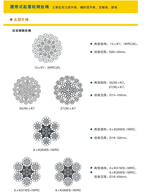 港口裝卸鋼絲繩:場橋、岸橋集裝箱裝卸作業(yè) 主起升鋼絲繩:6*36WS-IWRC 6*29FI-IWRC 6*K36WS-IWRC 6*K29FI-IWRC 小車牽引鋼絲繩 8*K29FI-IWRC 6*36WS-IWRC 散貨裝卸作業(yè)主起升 6*36WS-IWRC 6*29FI-IWRC 8*K36WS-IWRC 抓斗鋼絲繩6*36WS-IWRC 6*29FI-IWRC 8*49SWS-IWRC 門座式起重機(jī)裝卸作業(yè)起升繩 6*29FI-IWRC 6*36WS-IWRC K4*39S-5FC K4*48S-5FC